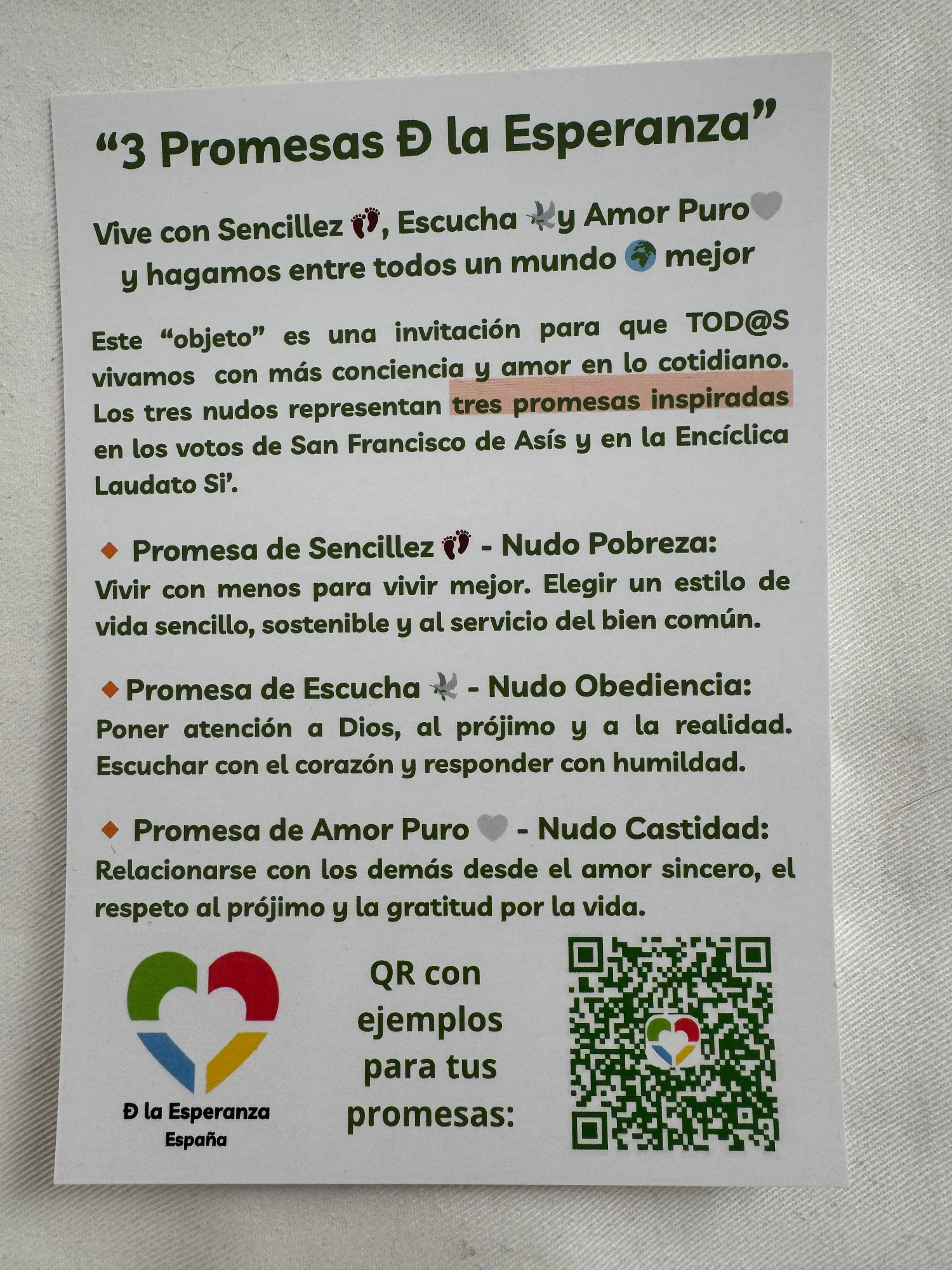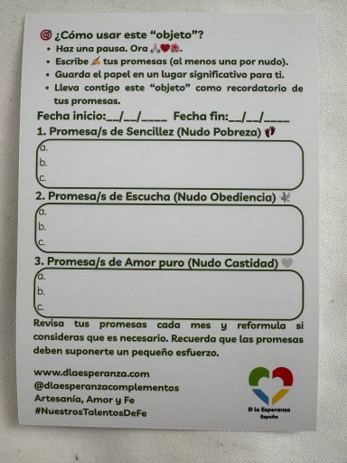 Este “objeto” (pulsera, collar, llavero, etc) es una invitación para que TOD@S vivamos con más conciencia y amor en lo cotidiano. Los tres nudos representan tres promesas inspiradas en los votos de San Francisco de Asís y en la Encíclica Laudato Si’.