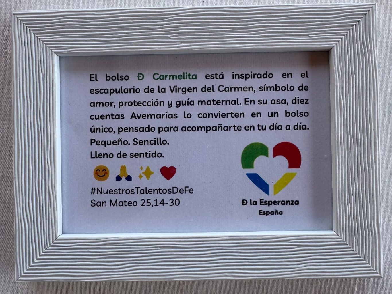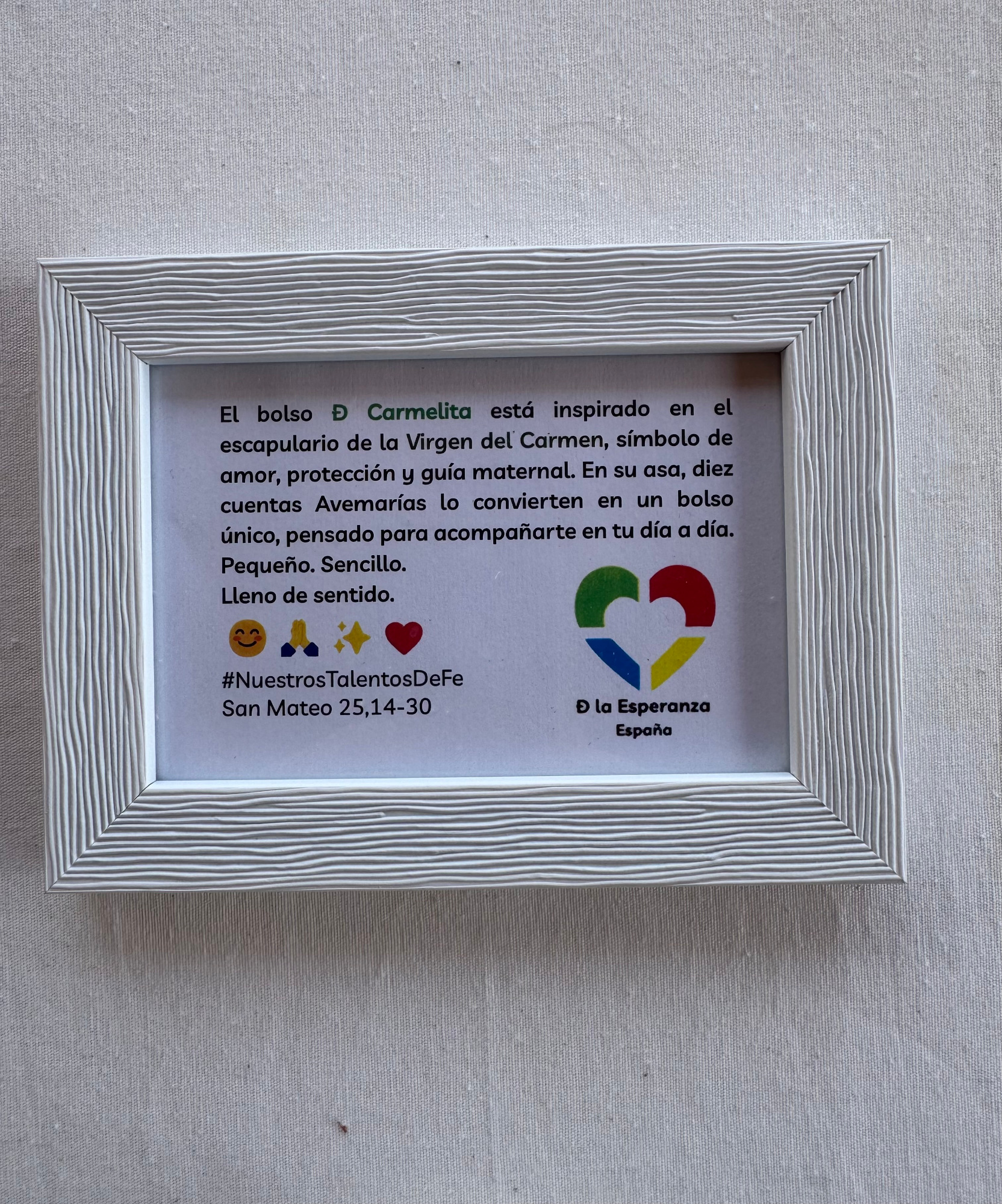 Pequeño y sencillo, pero lleno de significado, el bolso Carmelita no un simple accesorio: es un símbolo visible de fe y devoción, un toque de espiritualidad que nos acompaña en cada paso.